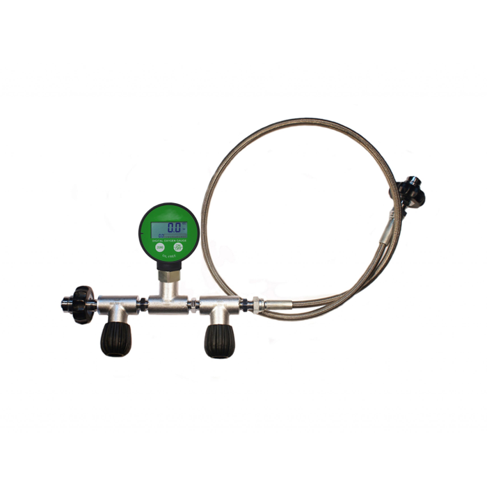 Przetoczka tlenowa do boostera TRM-OXY-D200. Wąż zbrojony owijką metalową o długości 2 metry z końcówkami G5/8″ gwint zewnętrzny. Manometr cyfrowy z możliwością przełączania jednostek na: bar, psi, kg/cm3, kpa, Mpa. Manometr posiada również pamięć ostatniej wartości.